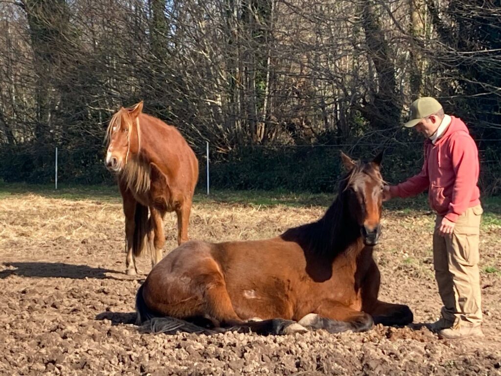 Vigo et Spartacus, nos deux grands chevaux bais, apprécient aussi beaucoup les balades en main. Ils sont très calmes et sereins. Se balader avec un cheval ne signifie pas nécessairement « à cheval ». Le plaisir est différent mais pas moins grand ! Se promener à leur côté permet de les observer, de les laisser brouter, de prendre le temps et de porter un regard différent sur la nature qui nous entoure